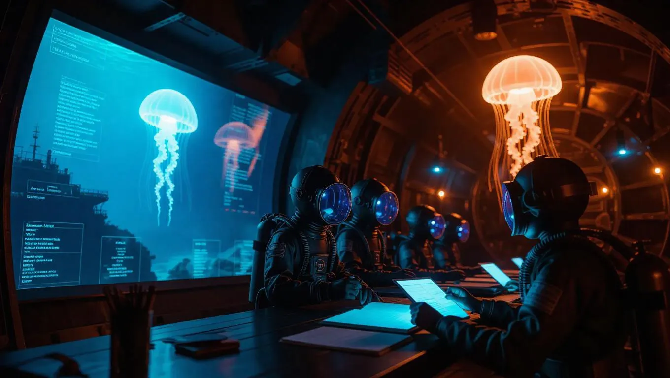 Futuristic underwater dome classroom, holographic screens vividly projecting history timelines, AI jellyfish tutors glowing softly with narratives, students wearing vintage diving suits diligently taking notes, surrounded by ancient shipwrecks and treasure.