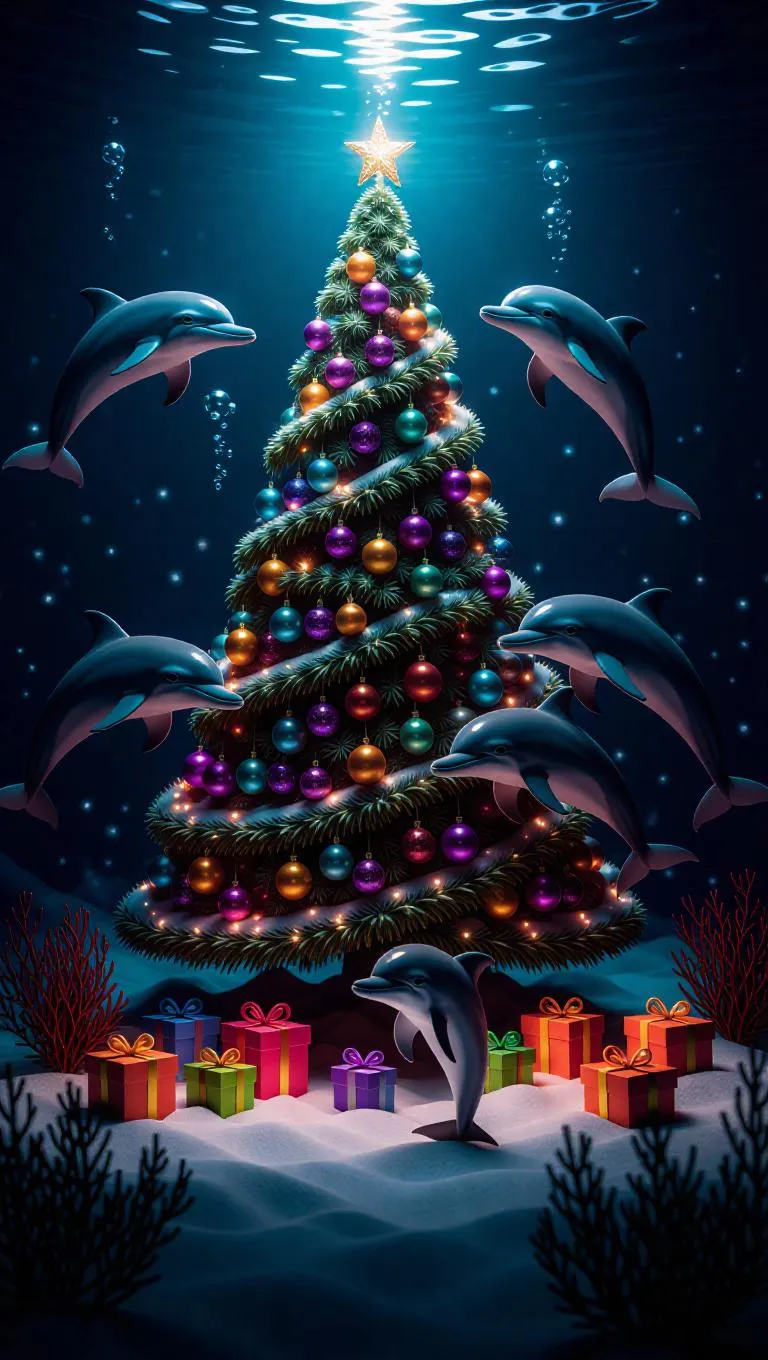 A festive underwater holiday celebration, dolphins adorning a vibrant kelp Christmas tree, fish exchanging coral gifts, jellyfish illuminating the scene with bioluminescent glow, snowflakes of bubbles drifting down, creating a magical and enchanting atmosphere.