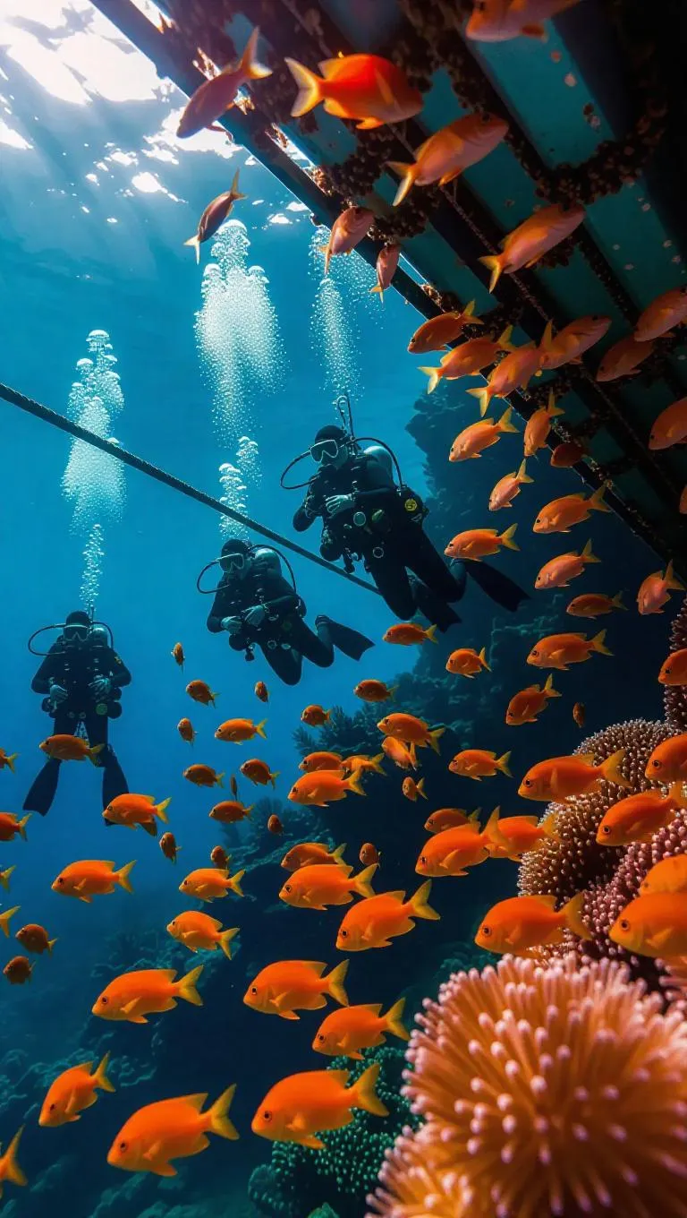 A group of talented underwater divers constructs a state-of-the-art submarine research station on the ocean floor, meticulously welding metal beams and installing advanced sensors. Colorful fish and curious shrimps hover nearby, observing their progress in the vibrant marine environment.