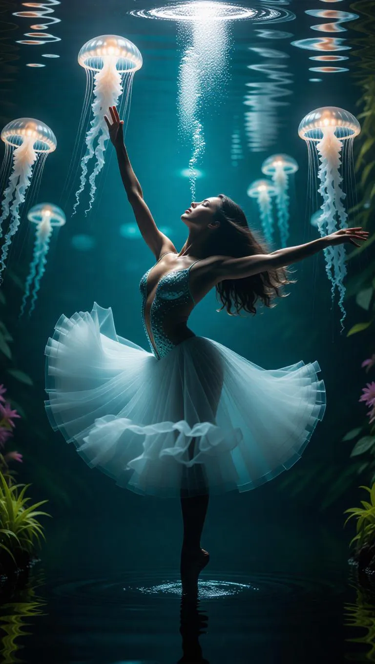 An underwater dancer performs a mesmerizing routine in a lush submerged garden, their fluid movements synchronized with the rippling currents. Jellyfish emit soft, bioluminescent glows in the background, enhancing the enchanting and magical atmosphere.