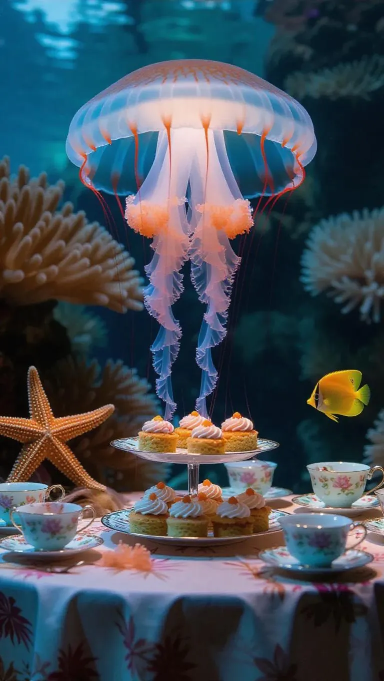 An enchanting underwater tea party hosted by a jellyfish, with its tentacles holding teacups and plates of coral cakes. A starfish plays the role of the butler, while a butterflyfish and a blenny enjoy the treats.