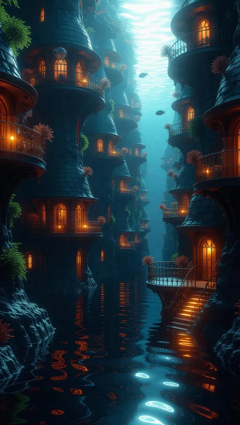 A surreal underwater village spiraling upward, bathed in bright surface light, organic lines, whimsical atmosphere, surrounded by swift currents and glistening water, with bioluminescent fish and fire-like coral adding a magical glow.