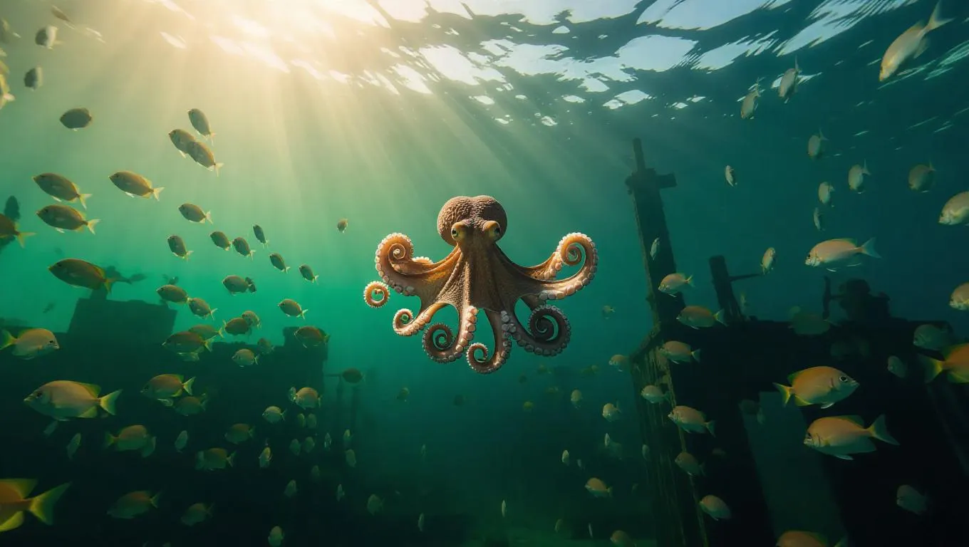 2. Underwater scene, a single octopus stealthily centered in deep green waters, surrounded by a school of colorful fish, soft gradients transitioning from dark to light, clean and elegant lines, ethereal glow, gentle currents, shipwreck in the background, sunlight filtering through the surface.