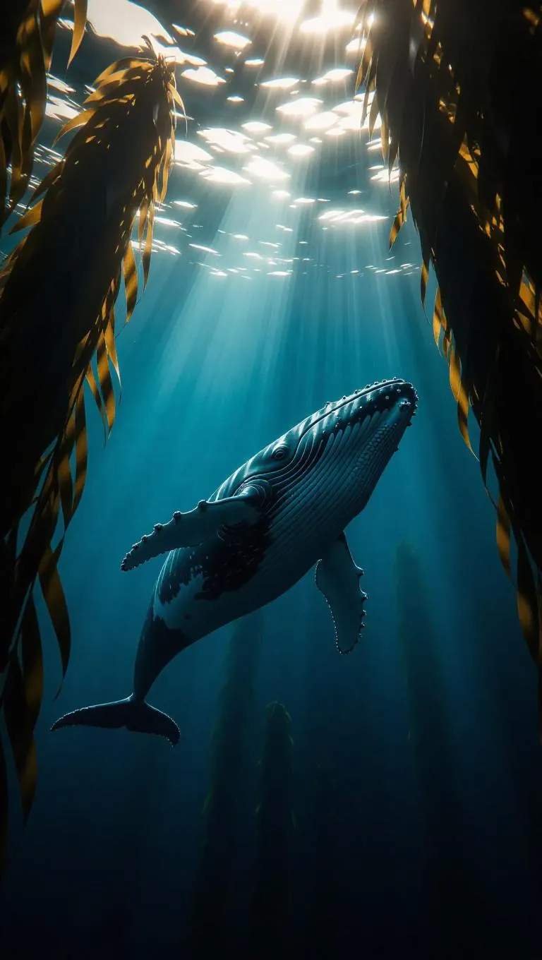 Cinematic shot of a luminous whale gliding into a kelp forest, ethereal light beams piercing through jagged cracks above, creating a mesmerizing underwater glow.