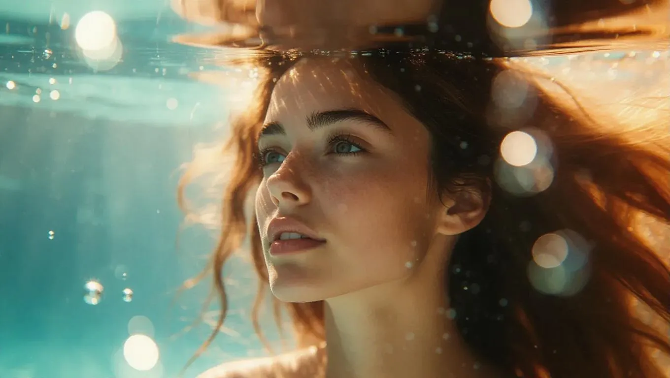 Cinematic underwater portrait of a woman with flowing hair, soft rays breaking through the surface, dreamy and reflective expression, bright bokeh effect, surrounded by gentle swirls and sparkling bubbles.