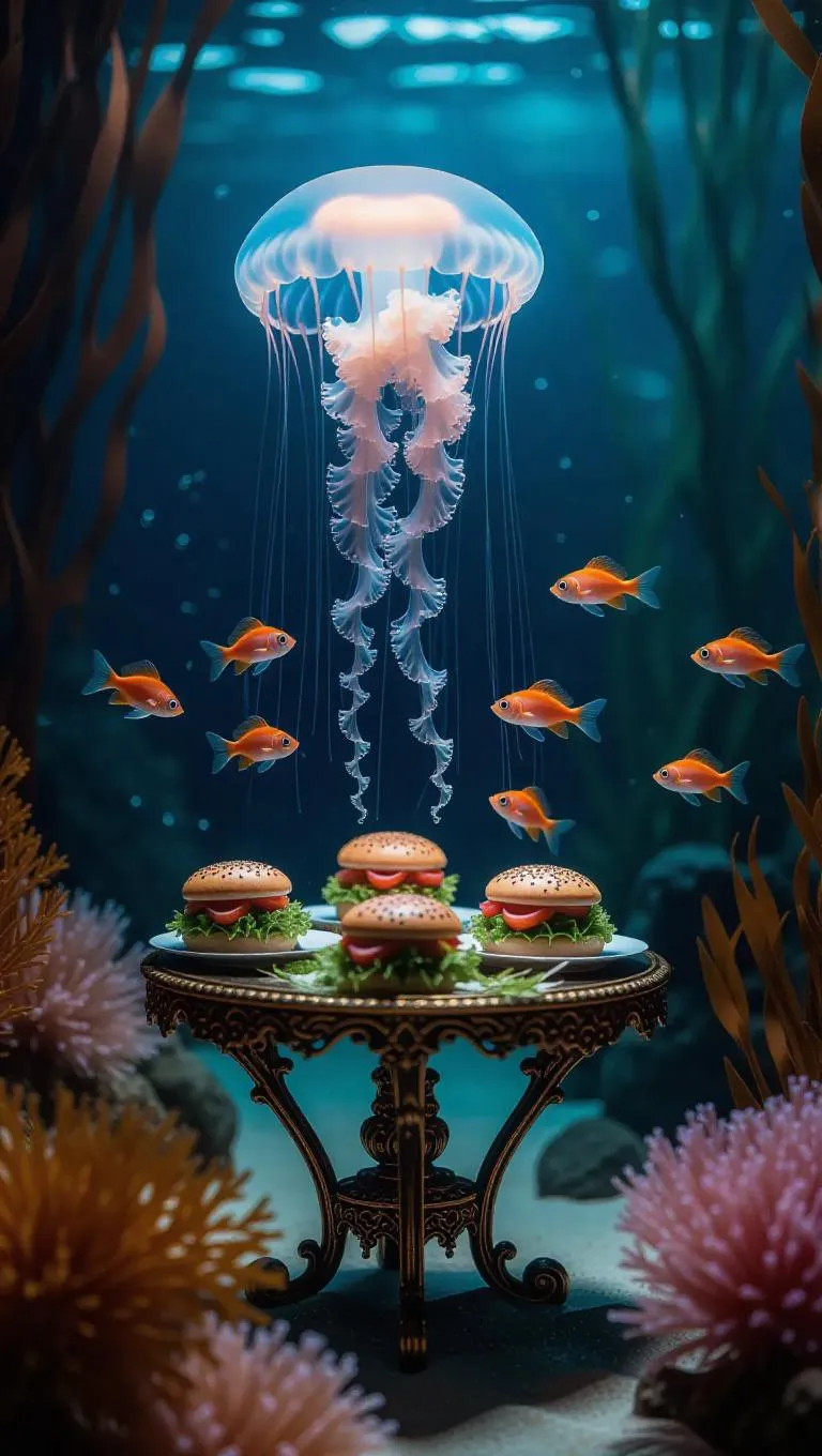 A whimsical underwater picnic scene where a jellyfish hovers over a small, ornate table covered with seaweed sandwiches and coral cakes. A school of curious guppies swims by, intrigued by the unusual setup, while elegant seahorses serve as attentive waiters.