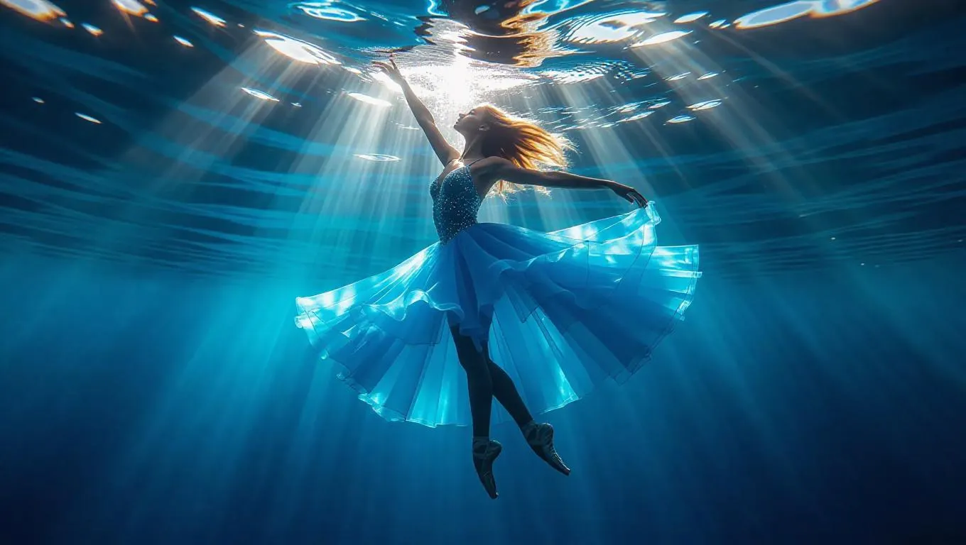 Surreal underwater ballet dancer, composed of shimmering water and radiant light, gracefully gliding through a crystalline, vibrant sea, surrounded by soft waves, creating a mesmerizing dance of colors and motion.