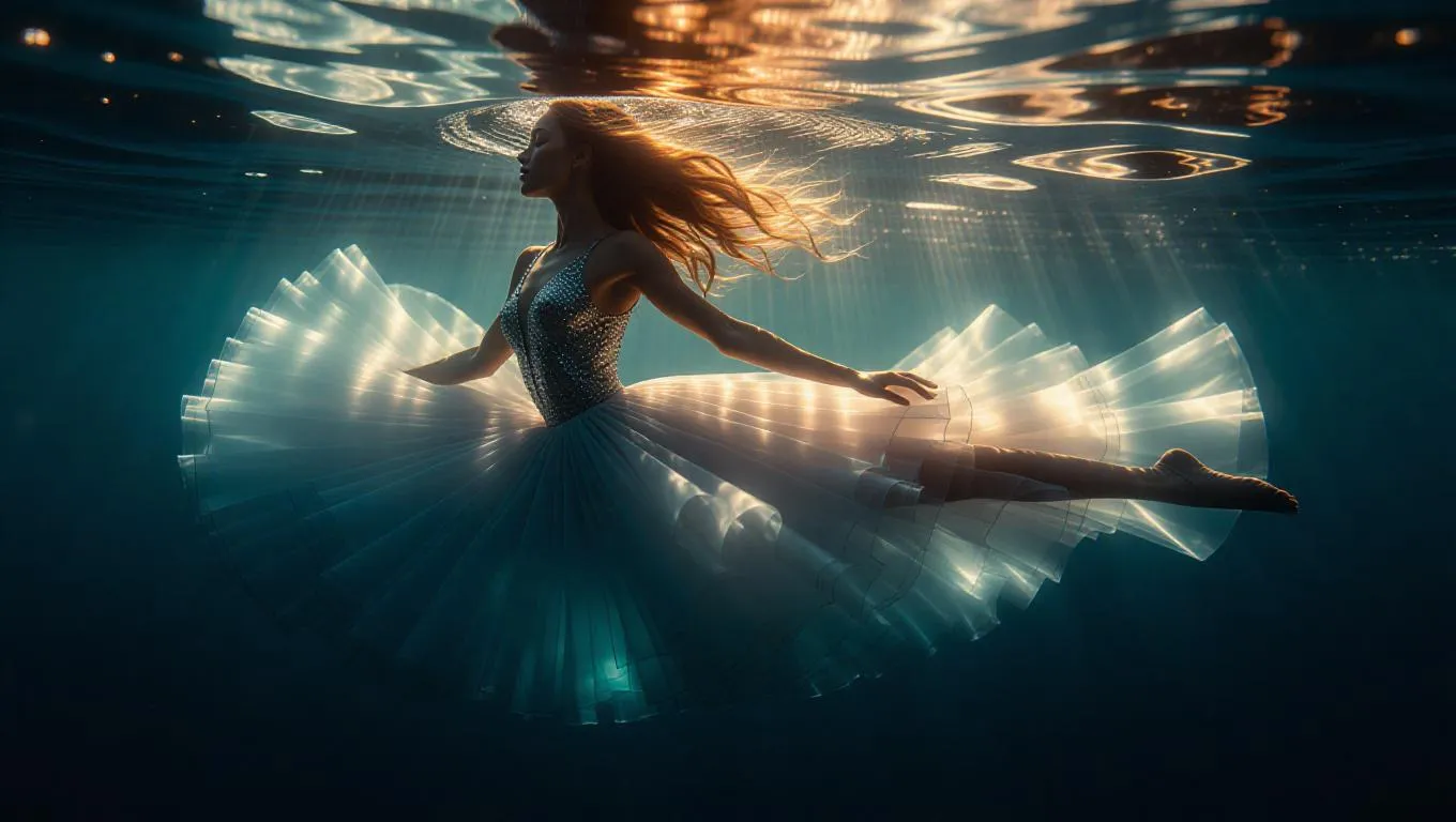 Surreal underwater ballet dancer, composed of shimmering water and radiant light, gracefully gliding through a tranquil, luminescent sea, surrounded by ethereal bioluminescent particles, creating a mesmerizing dance of colors and motion.