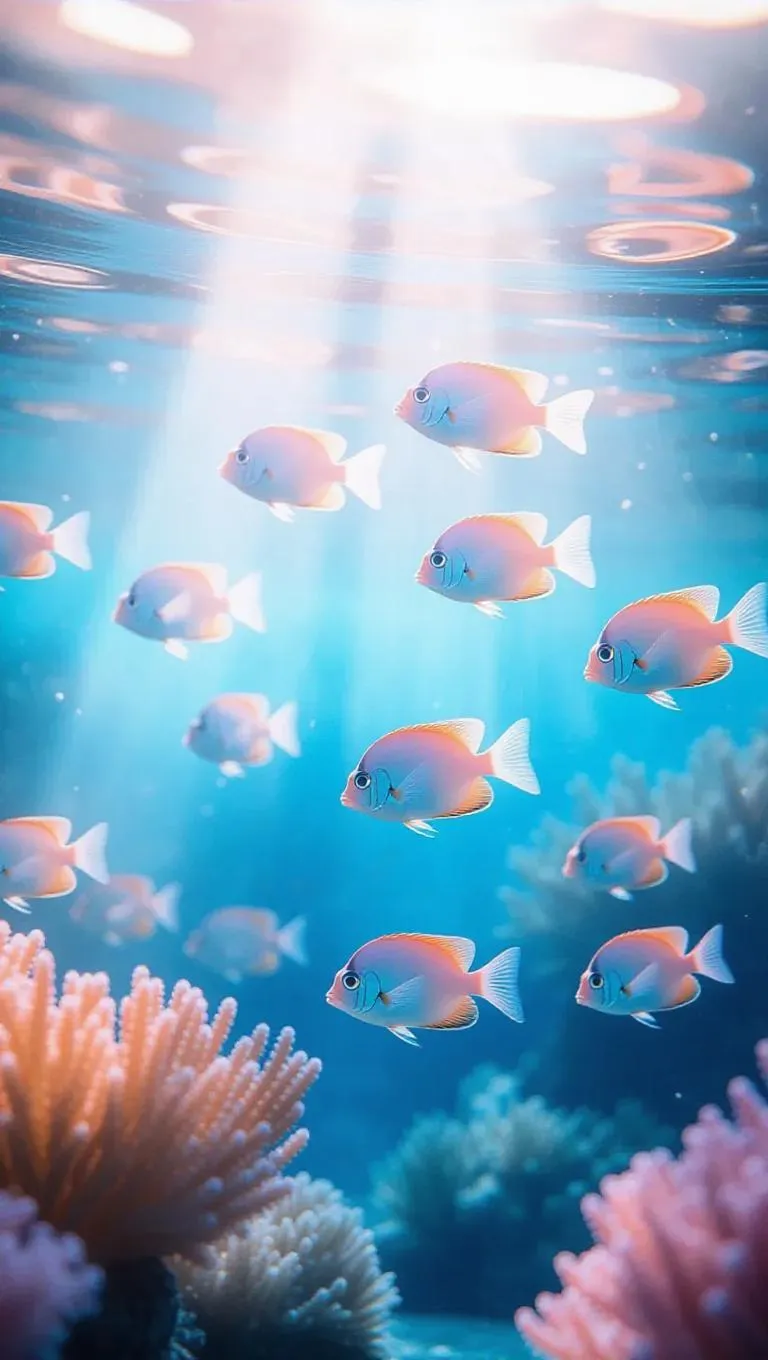 5. Soft-focus dreamy underwater scene of tropical fish swimming merrily, pastel colors, gentle ripples, ethereal light beams, and a serene, tranquil atmosphere.