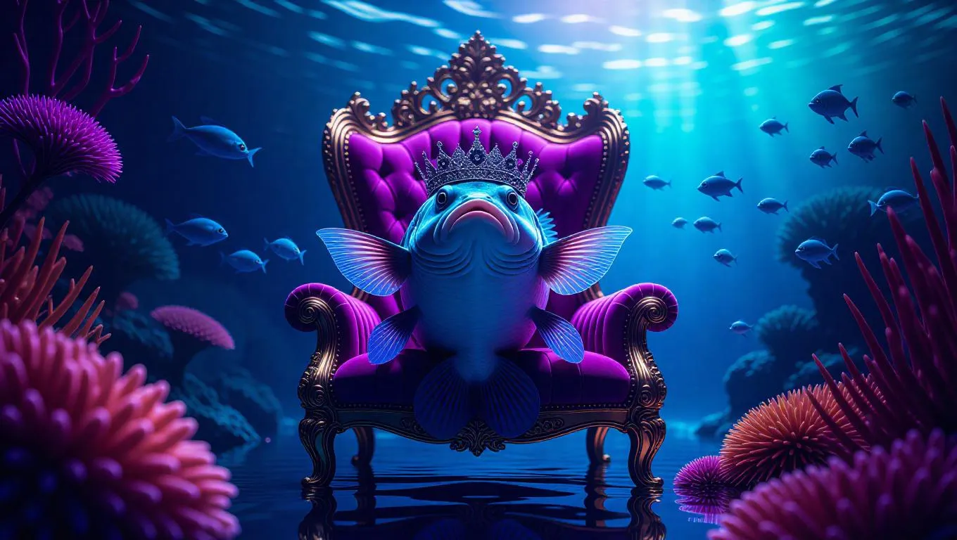 A majestic catfish adorned with a majestic crown, lounging gracefully on a beautiful coral throne, amidst a whirl of tiny, bioluminescent fish, situated in a vivid underwater landscape, with shimmering waves and mystical ambiance.