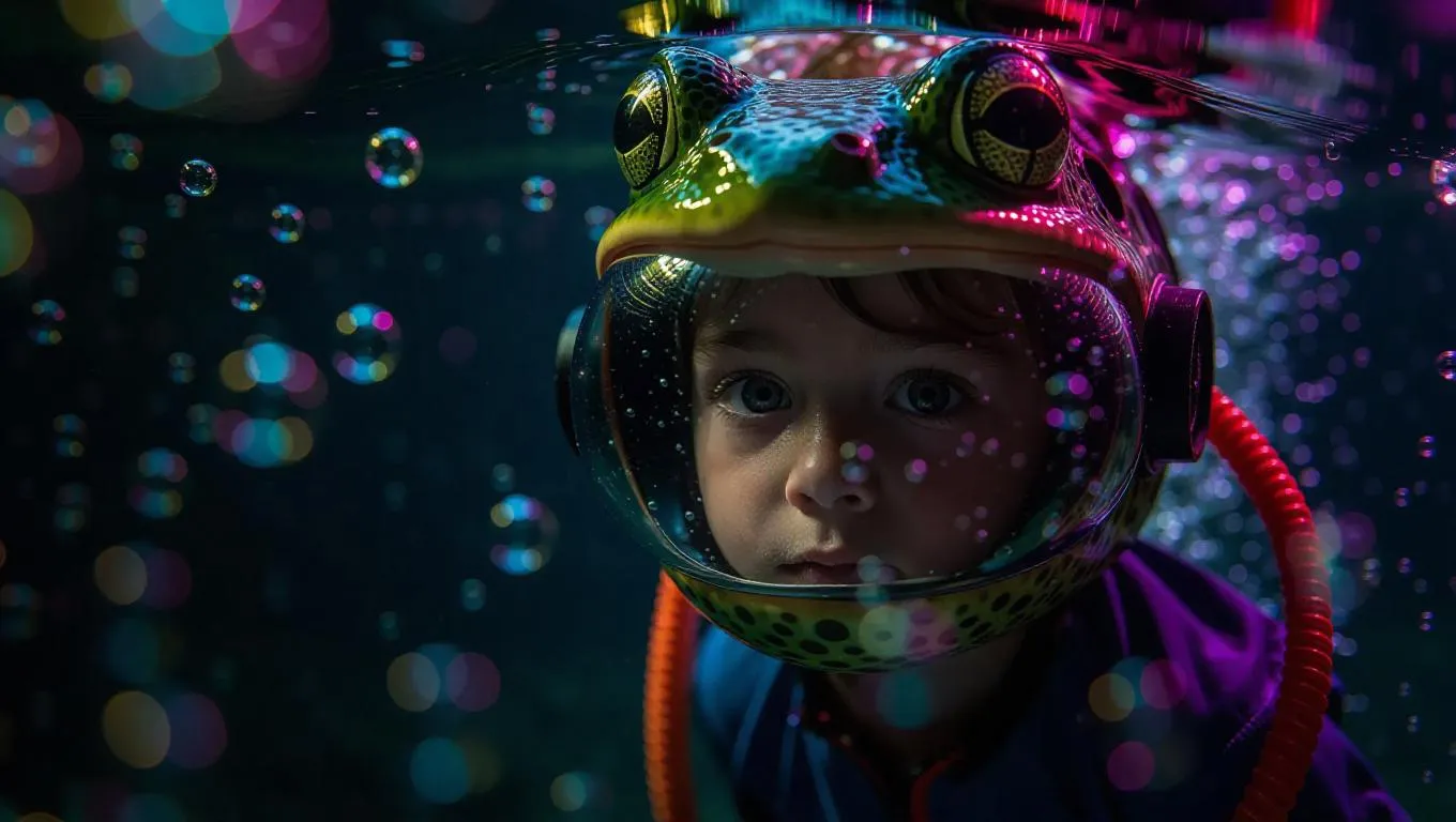 Macro underwater scene of child wearing frog-shaped bubble helmet, rainbow refractions through shimmering membranes, curious expression, blurred foreground, glowing krill riding spiral currents, ethereal bioluminescent flora, gentle water ripples, bright colors.