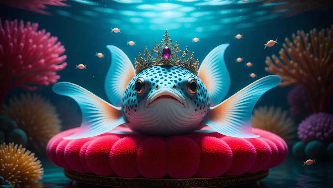 An exquisite mystical catfish crowned with a magical tiara, resting on a vibrant coral seat, flanked by a shimmering cloud of tiny, bioluminescent critters, in a splendid underwater fantasy world, with vivid water and ethereal illumination.
