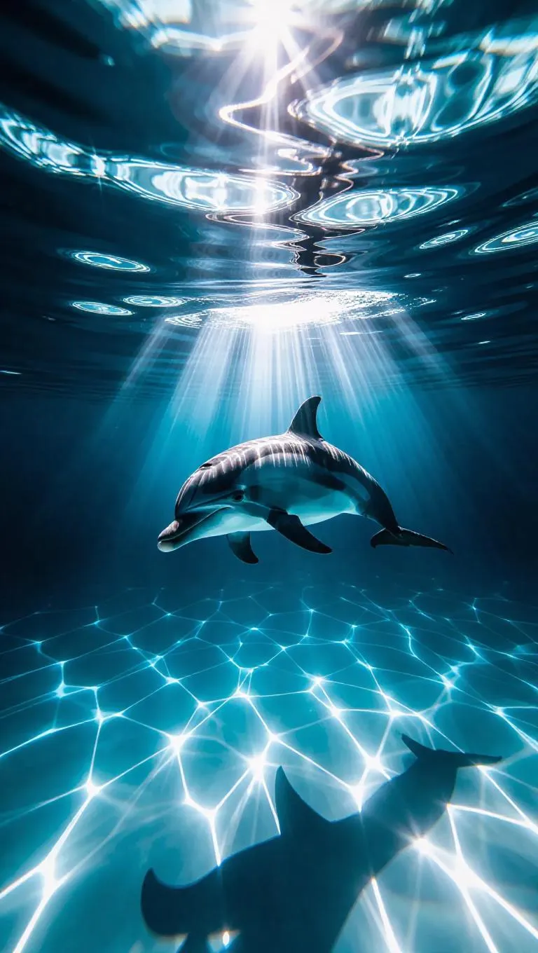Cinematic shot of a shimmering dolphin gliding beneath ice-covered waters, ethereal light beams piercing through jagged cracks above, creating a mesmerizing underwater glow.