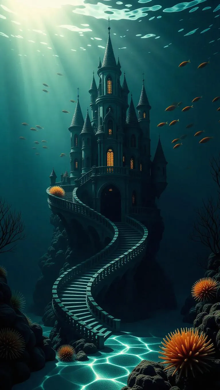 A dreamlike underwater chateau spiraling downward, enveloped in soft surface light, angular lines, serene atmosphere, surrounded by tranquil currents and sparkling water, with bioluminescent fish and glowing anemones adding a magical glow.
