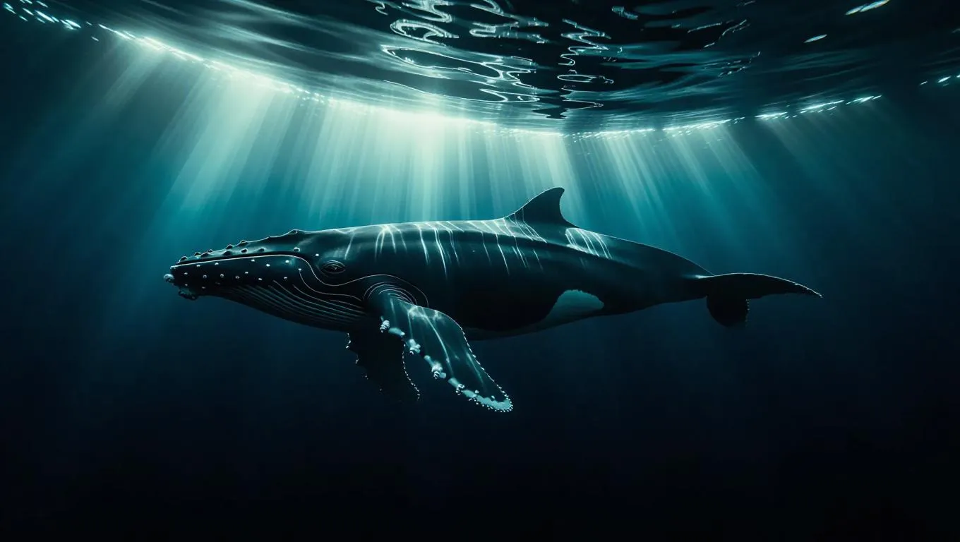 Cinematic shot of a luminous whale gliding beneath dark ocean depths, ethereal light beams piercing through jagged cracks above, creating a mesmerizing underwater glow.