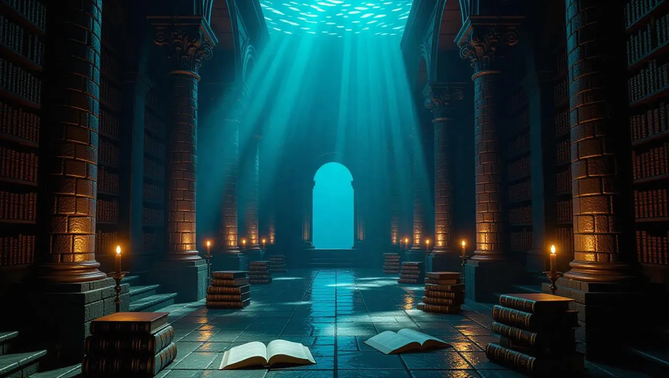 A grand underwater library with brick columns forged by the ocean's magic, where leather-bound books twirl in the gentle tides. Diffused sunbeams filter from the surface above, creating mystical shapes on imaginative merfolk scholars.