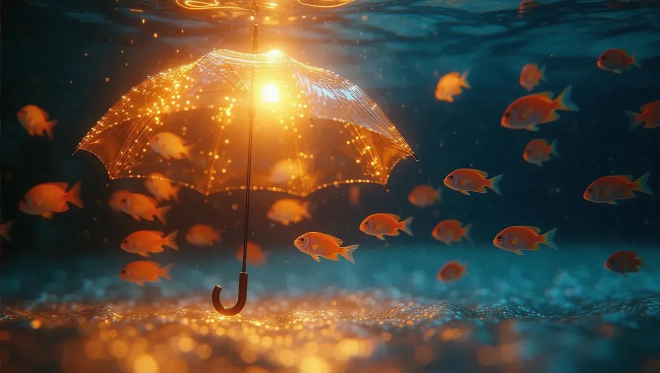A glowing umbrella gently drifting underwater, surrounded by colorful fish swimming gracefully, creating a whimsical and playful mood, with a warm, golden light illuminating the scene.