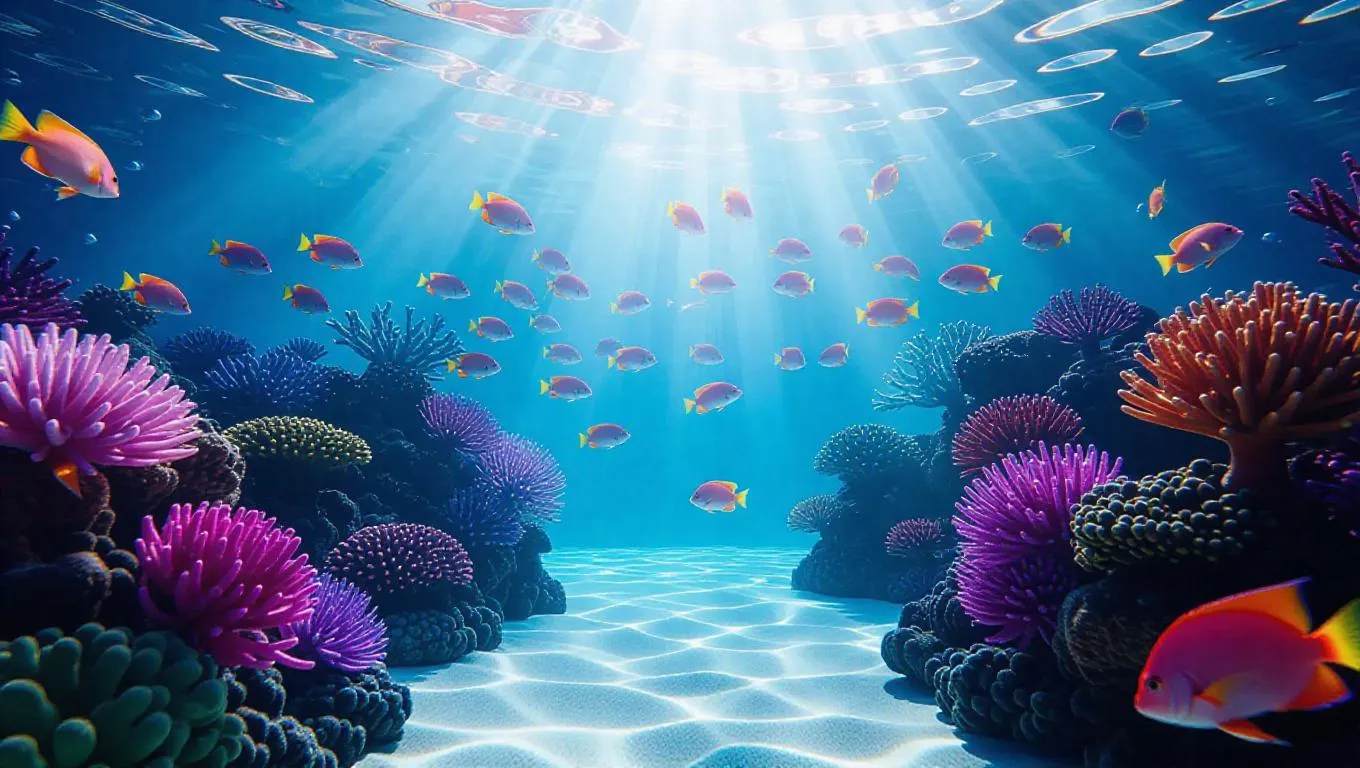 Surreal underwater garden party, ethereal light beams and playful ribbon currents, dreamlike colors, weightless atmosphere, ethereal bubbles, soft glowing lights, vibrant coral backdrop, serene and whimsical, surrounded by gentle sea currents, vibrant parrotfish schooling together.