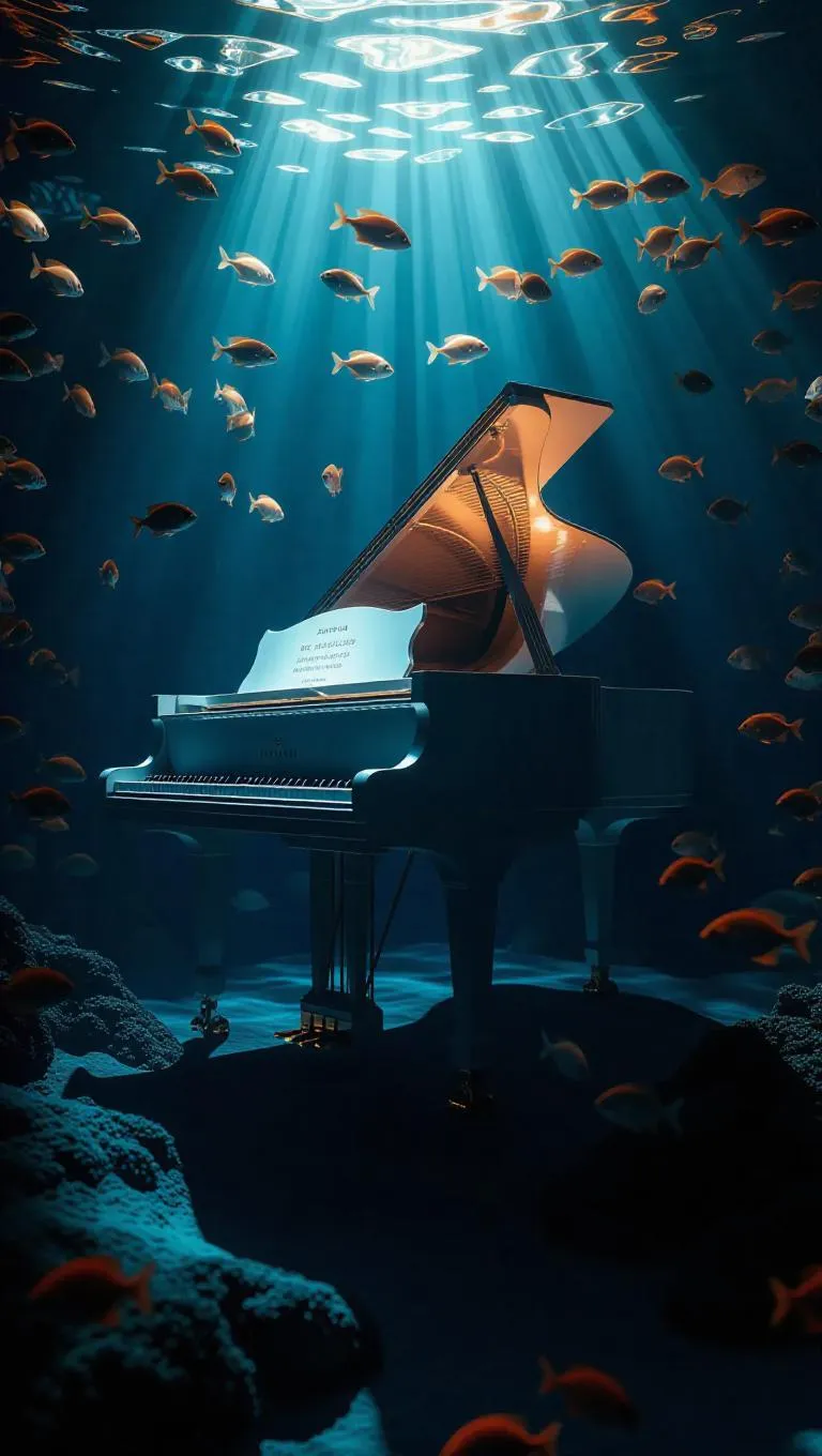 A surreal underwater scene of a piano shaped like a seashell floating with the currents, bright sunlight racing down to touch it, creating a mesmerizing play of light and shadow, lively lighting, highly detailed, surrounded by swirling schools of animated fish.