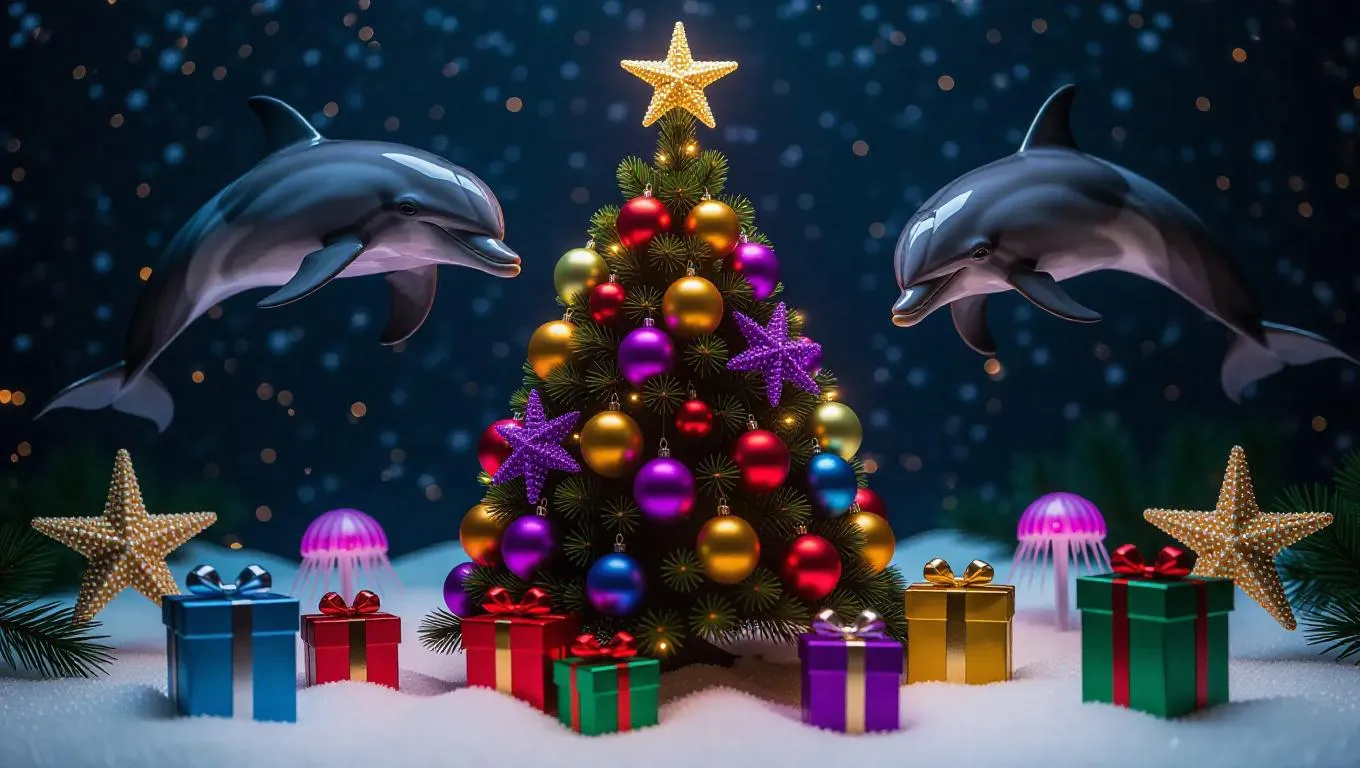 A festive underwater holiday celebration, dolphins adorning a vibrant coral Christmas tree, fish exchanging starfish gifts, jellyfish illuminating the scene with bioluminescent glow, snowflakes of bubbles drifting down, creating a magical and enchanting atmosphere.