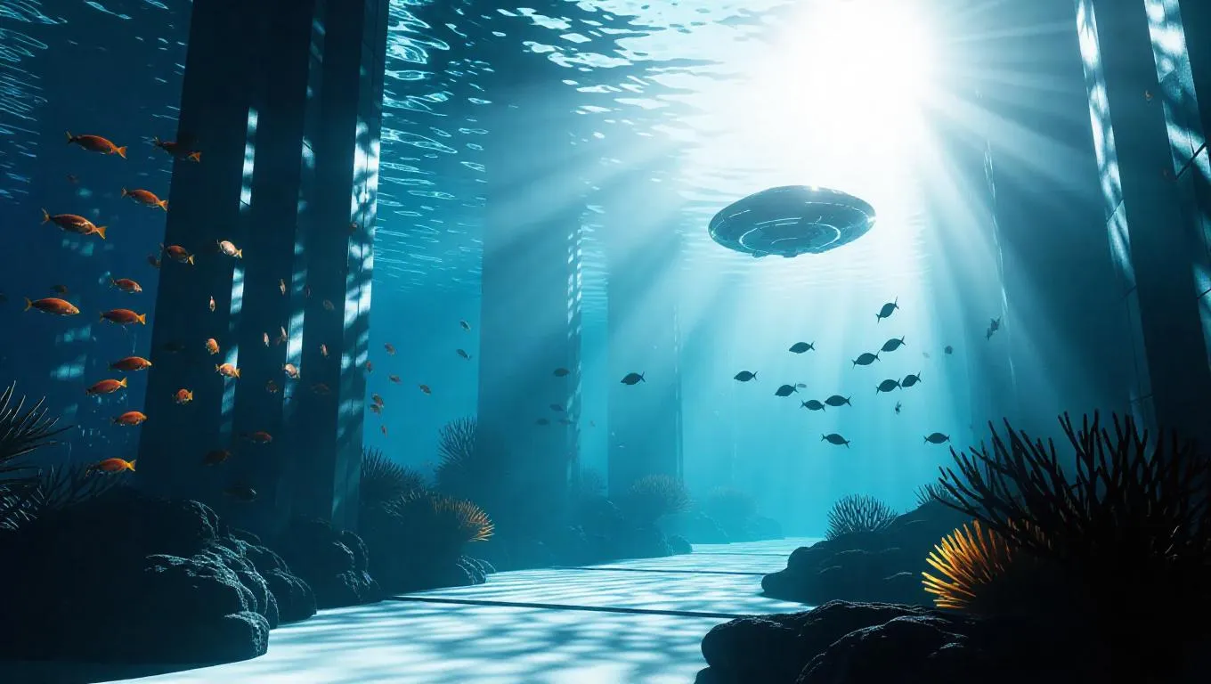 A futuristic human life scene underwater, showcasing submerged defense systems and security drones, flames casting an ethereal glow, rays of sunlight piercing through the water, creating a protective play of light and shadow, cinematic lighting, highly detailed, surrounded by swirling schools of vigilant fish, vibrant coral reefs, and sleek, modern architecture.
