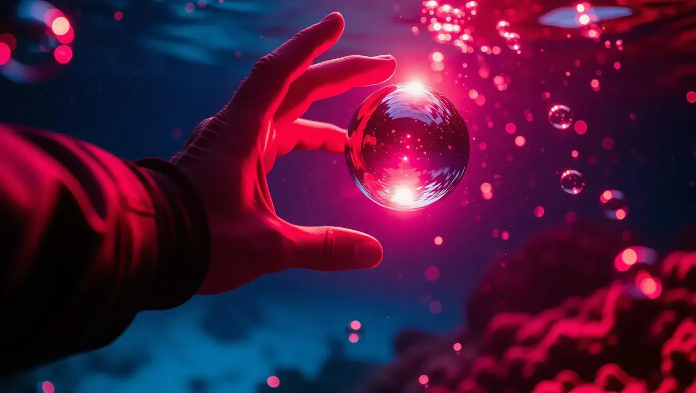 Cinematic close-up of a submarine pilot's hand reaching toward a sparkling orb glowing in the dark water, dramatic shadows, ethereal crimson light, bubbles swirling around, underwater debris adding depth and texture