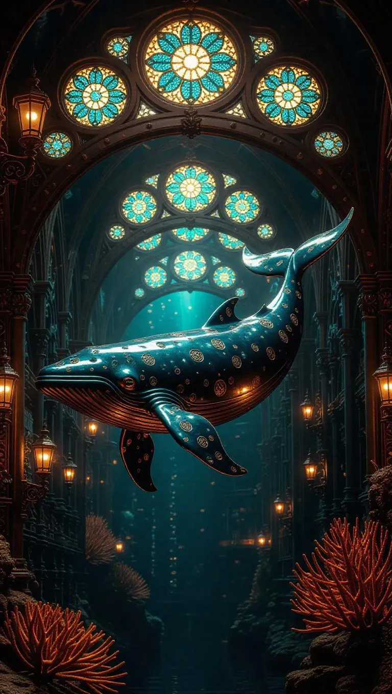 Steampunk whale-bus gliding beneath neo-gothic coral arches, seahorse conductors attentively adjusting copper pocket watches, stained glass windows showcasing bursts of pixelated starfish, mosaic style with fractured colors, whimsical vibe