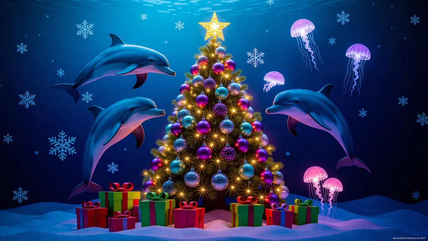 A festive underwater holiday celebration, dolphins adorning a vibrant coral Christmas tree, seahorses exchanging seaweed gifts, jellyfish illuminating the scene with a warm bioluminescent glow, snowflakes of bubbles drifting down, creating a magical and enchanting atmosphere.