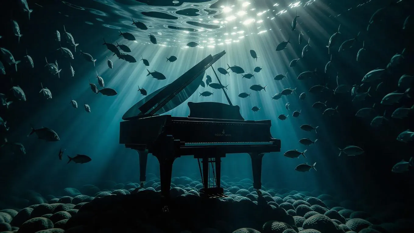 A surreal underwater scene of a grand concert piano sinking unexpectedly fast, beams of sunlight rushing through the water, creating a mesmerizing play of light and shadow, urgent lighting, highly detailed, surrounded by swirling schools of startled fish.