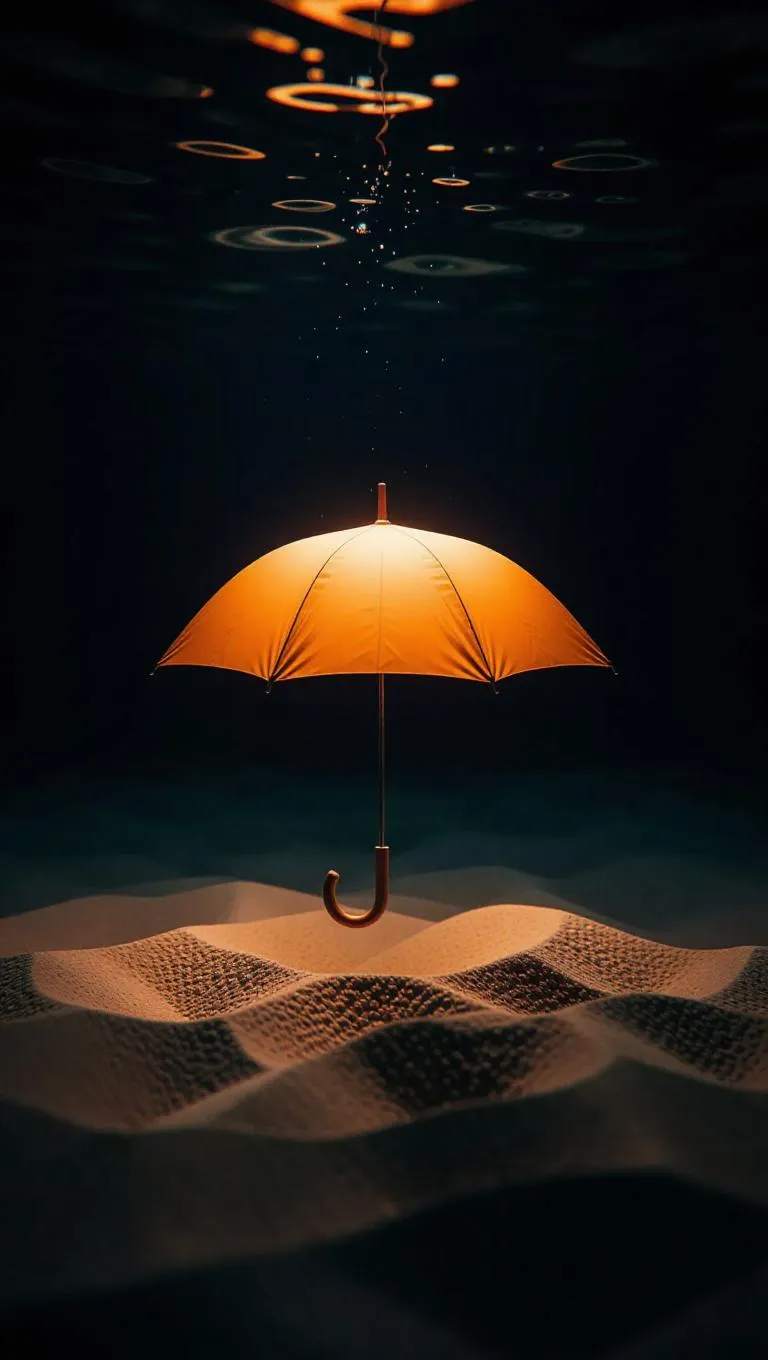 A glowing umbrella gently drifting underwater, surrounded by swirling currents of sand and debris, creating a chaotic and mysterious mood, with a dark, shadowy light providing an eerie glow.