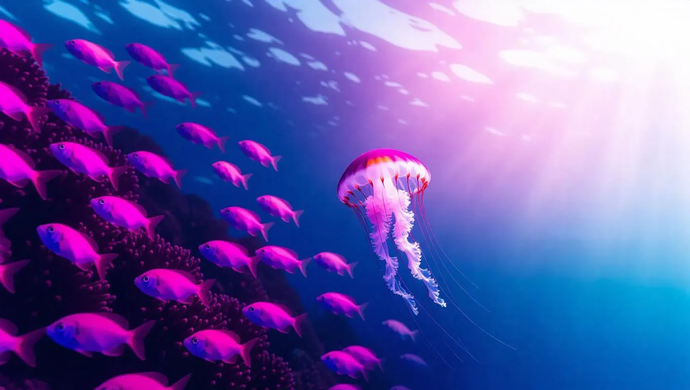 7. Underwater scene, a single jellyfish gracefully centered in deep indigo waters, surrounded by a school of fluorescent fish, soft gradients transitioning from dark to light, clean and elegant lines, ethereal glow, gentle currents, reefs in the background, sunlight filtering through the surface.