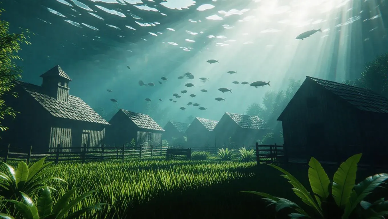 A surreal farmyard scene underwater, with submerged barns and paddocks, bursts of sunlight illuminating through the water, creating a vibrant play of light and shadow, cinematic lighting, highly detailed, surrounded by swirling schools of jungle fish, evoking a dreamlike atmosphere.
