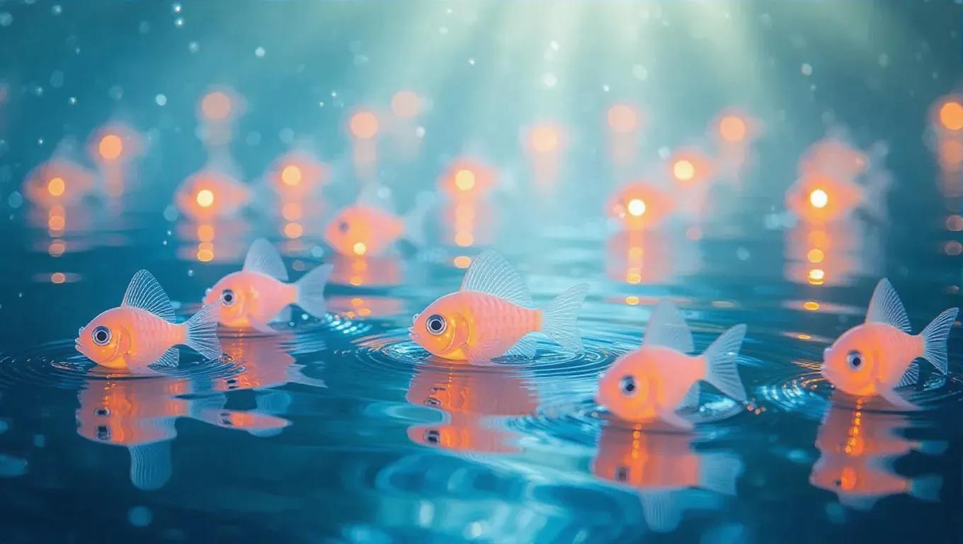 17. Soft-focus dreamy underwater scene of lanternfish glowing softly, pastel colors, gentle ripples, ethereal light beams, and a serene, tranquil atmosphere.