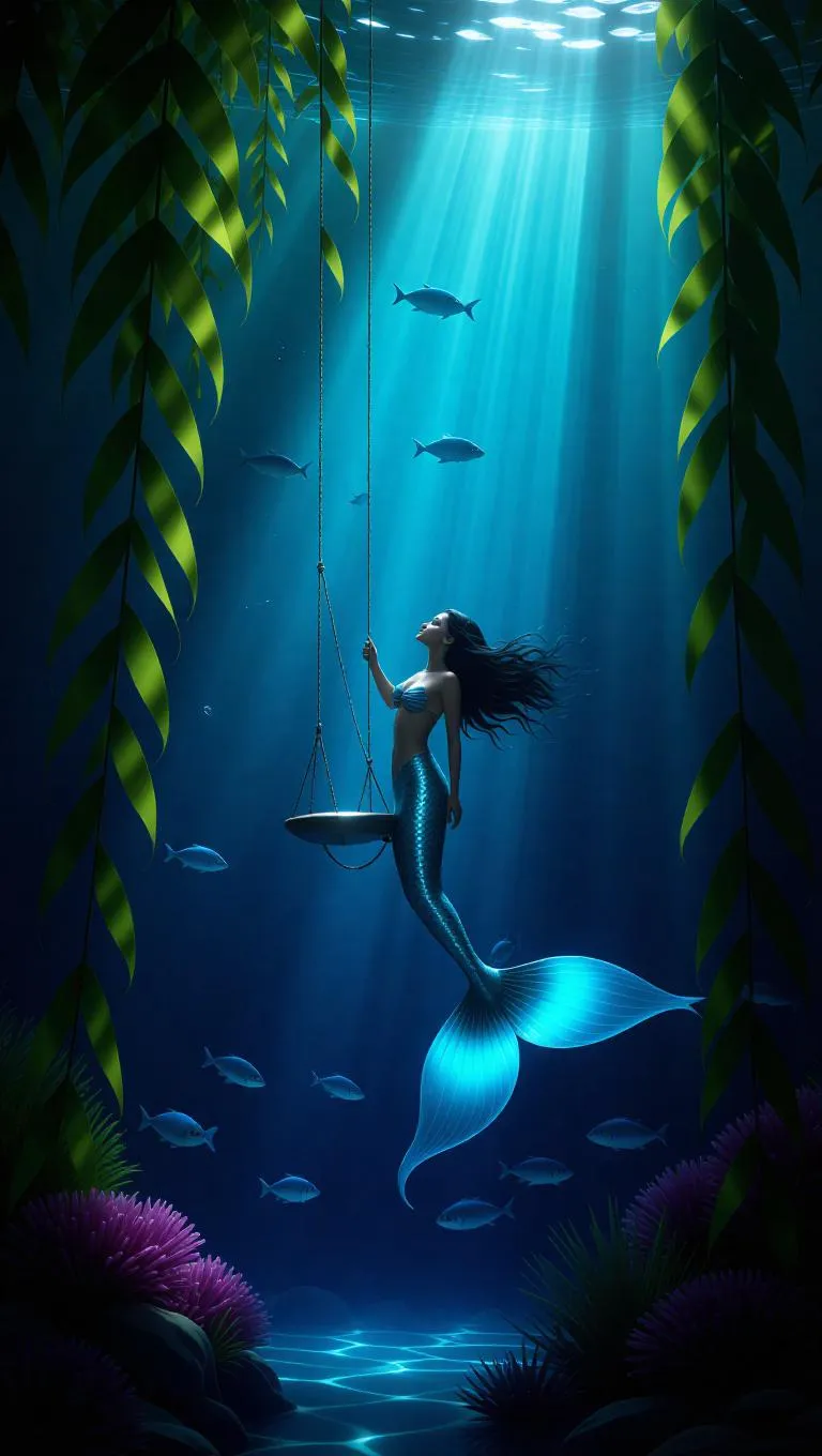 Soft-focused fantasy scene, an underwater swing hanging from a giant kelp stalk, a mermaid gracefully reaching out to touch the ethereal light beams, glowing plankton shimmering in the water, ethereal light beams piercing through the surface, vibrant marine life swimming around, creating a magical and serene ambiance.