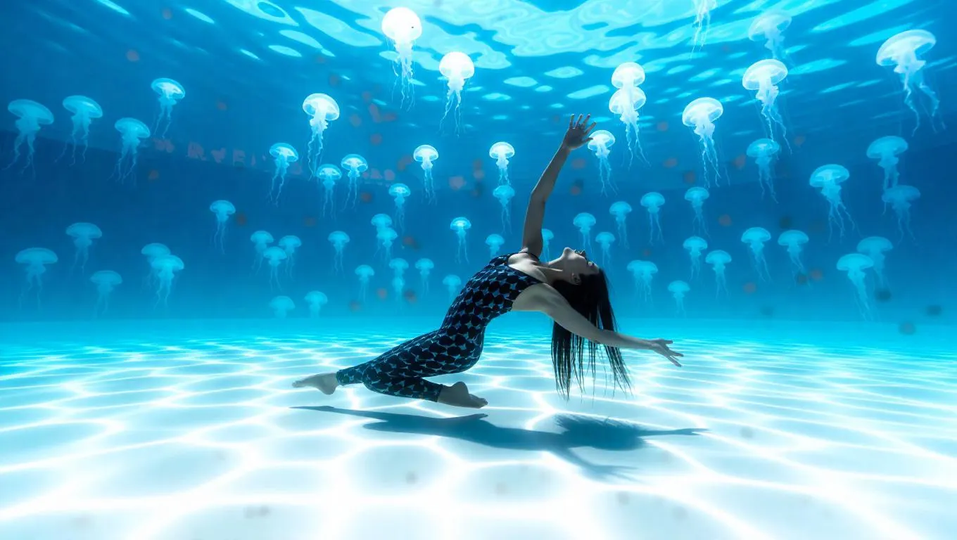 An underwater contortionist performs a mesmerizing routine in a magical lagoon, their sinuous movements synchronized with the rolling waves. Jellyfish emit soft, bioluminescent glows in the background, enhancing the enchanting and magical atmosphere.