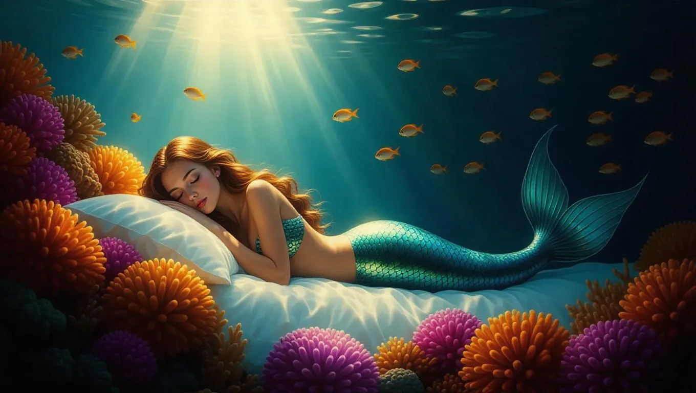 Digital oil painting of a mermaid resting on a bed of glowing corals, ethereal light cascading from above, soft and dreamy, surrounded by gliding bioluminescent fish, with a mystical aura enhancing the serene underwater atmosphere.