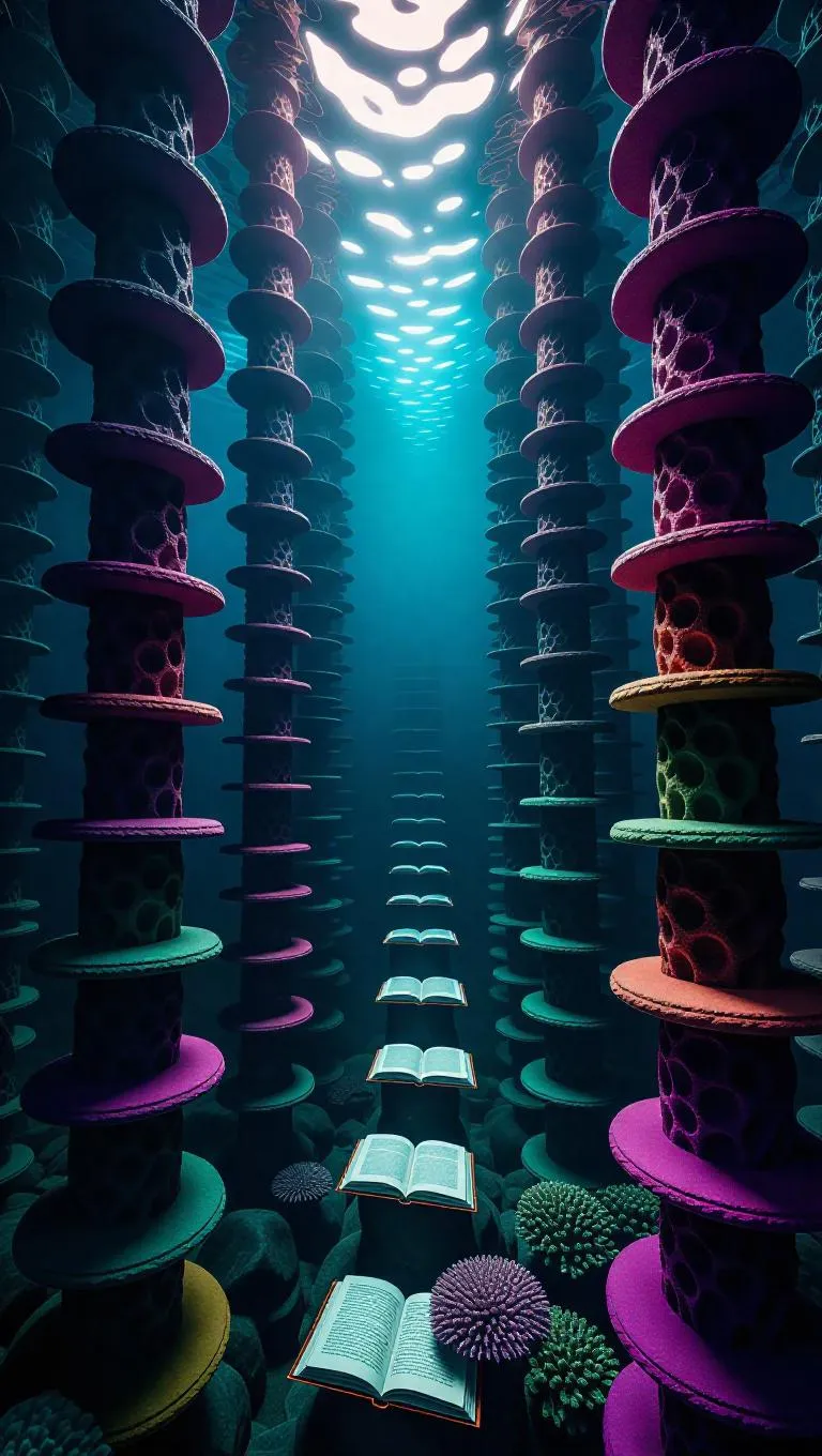 A grand underwater library with zigzag columns of colorful rocks, where pages swirl gracefully in the current. Distant light filters from above, casting enchanting shadows on diligent merfolk scholars.