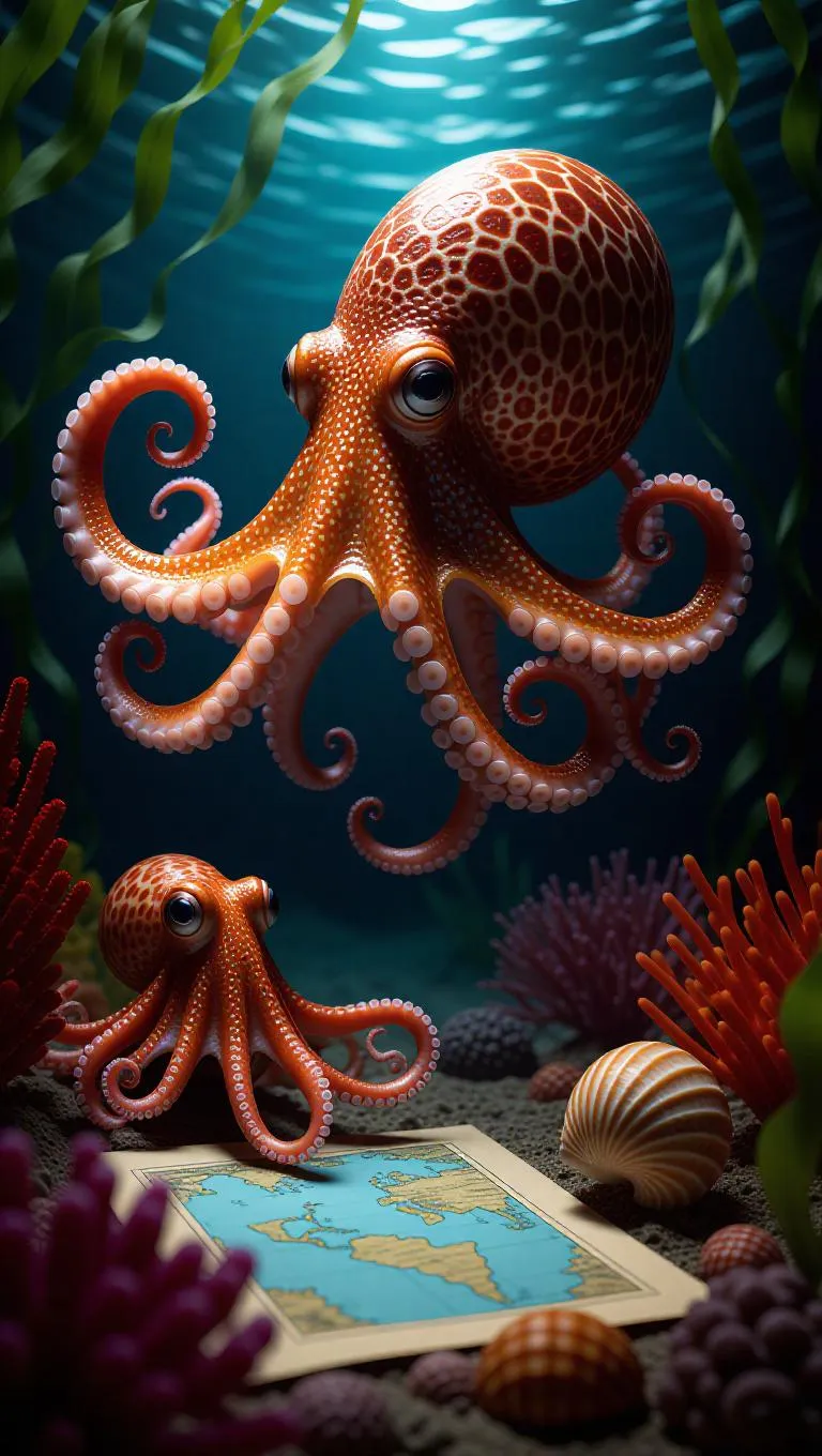 A mysterious underwater detective scene, an agile cuttlefish investigates a missing pearl case, interrogating a nervous octopus and a shifty crab. Clues like cracked shells and a stained map are scattered among vibrant coral and floating seaweed, creating a suspenseful and intriguing atmosphere.