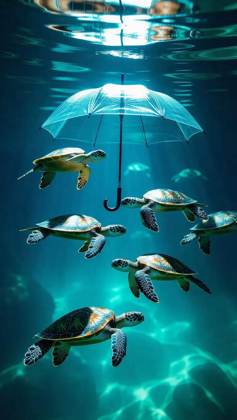 A glowing umbrella gently drifting underwater, surrounded by colorful sea turtles gliding by, creating a peaceful and harmonious mood, with a cool, turquoise light illuminating their path.