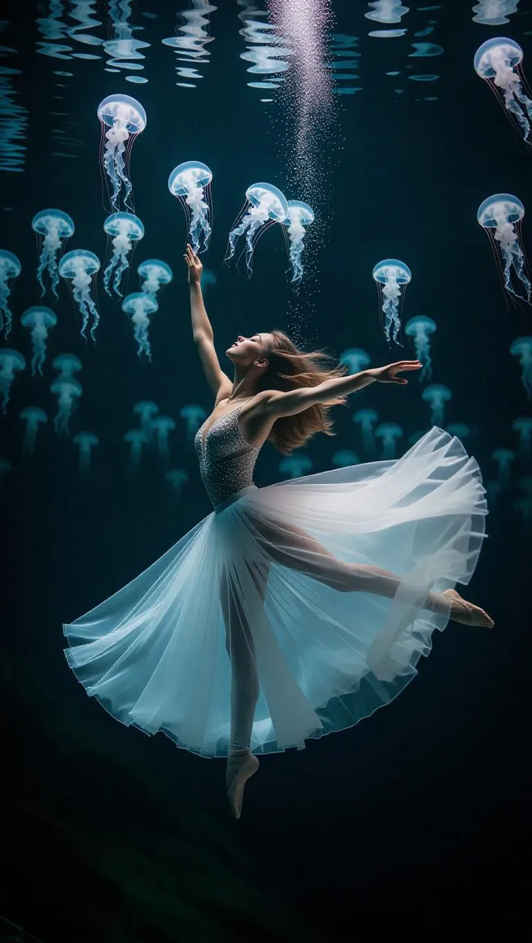 An underwater dancer performs a mesmerizing routine in a tranquil estuary, their fluid movements synchronized with the rich aquatic life. Jellyfish emit soft, bioluminescent glows in the background, enhancing the enchanting and magical atmosphere.