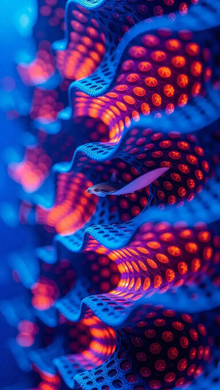 4. Macro close-up of coral skyscraper facade, intricate luminescent algae patterns pulsating with tidal rhythms, manta ray shadows gracefully gliding across bio-concrete surfaces, deep focus on vibrant phytoplankton hues, capturing the dynamic interplay of nature and architecture.