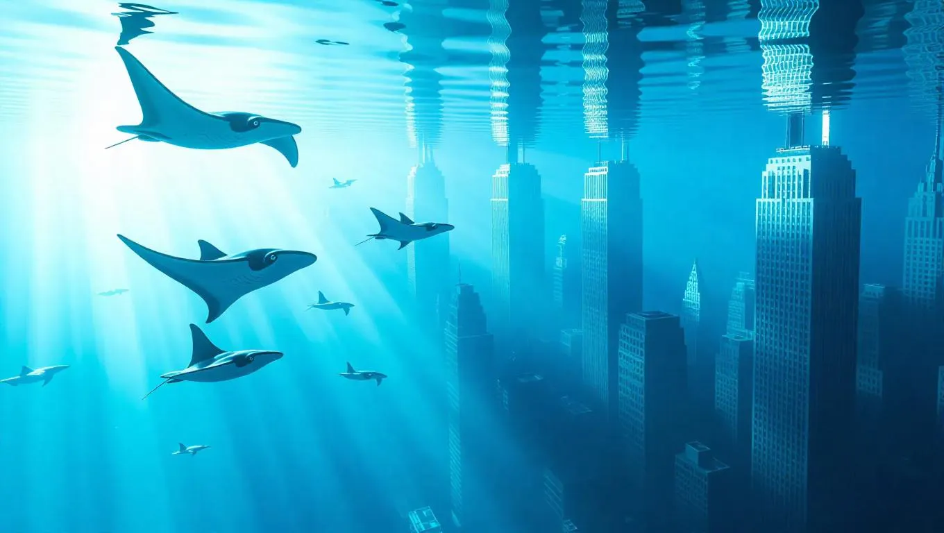 A cityscape scene underwater, submerged skyscrapers and streets, bright rays illuminating lost relics, creating a haunting play of light and shadow, cinematic lighting, highly detailed, surrounded by gliding manta rays.