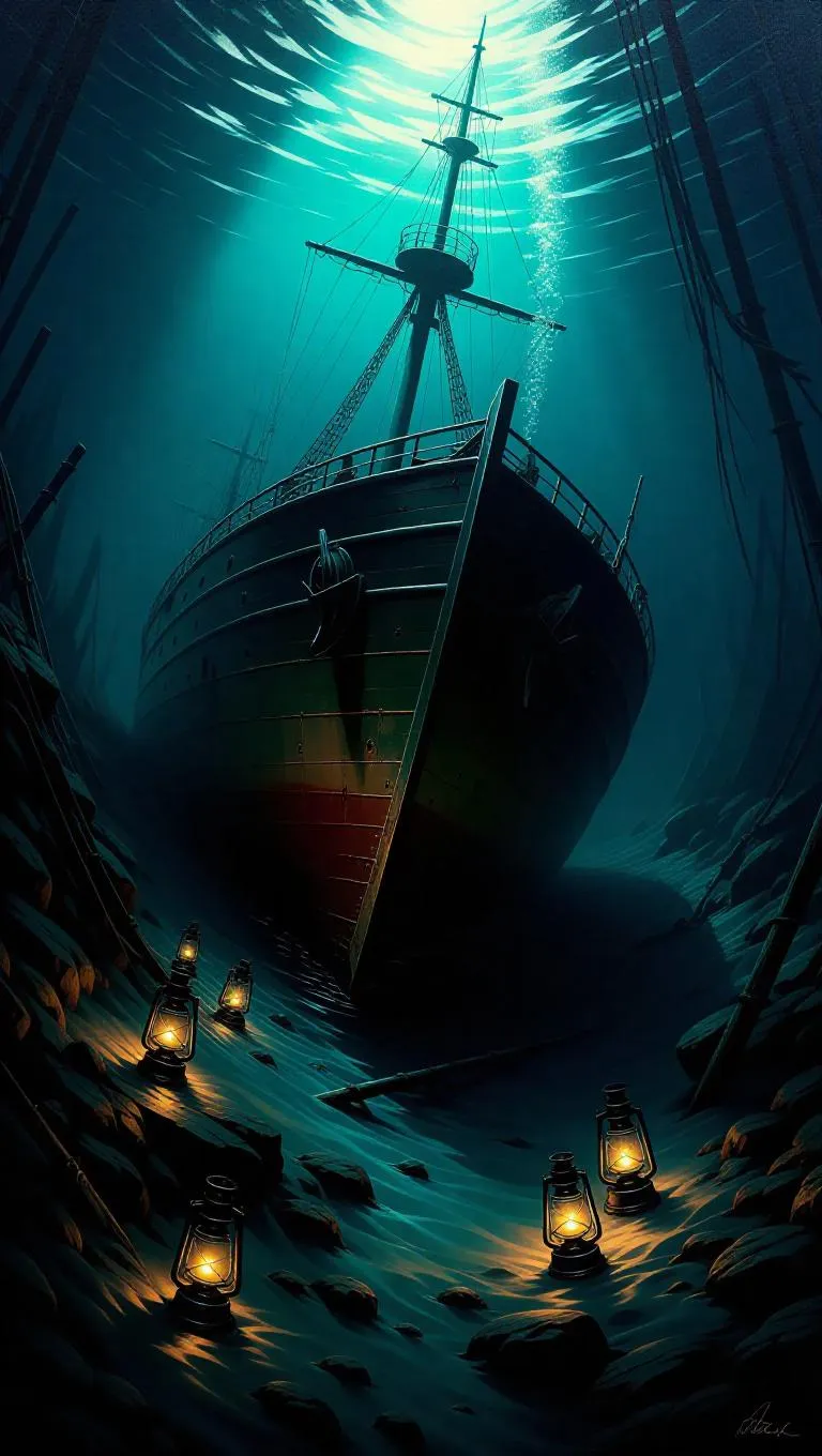 Oil painting of a shipwreck split in two, illuminated by twinkling underwater lanterns, rich textures, dramatic shadows, and swirling underwater currents, creating a hauntingly beautiful scene.