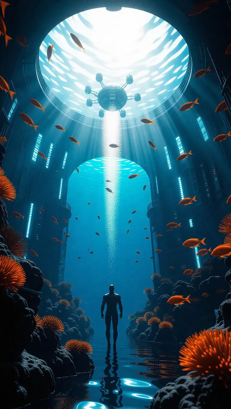 A futuristic human life scene underwater, incorporating submerged defense systems and security drones, surrounded by twisting flames, rays of sunlight piercing through the water, creating a protective play of light and shadow, cinematic lighting, highly detailed, surrounded by swirling schools of vigilant fish, vibrant coral reefs, and sleek, modern architecture.