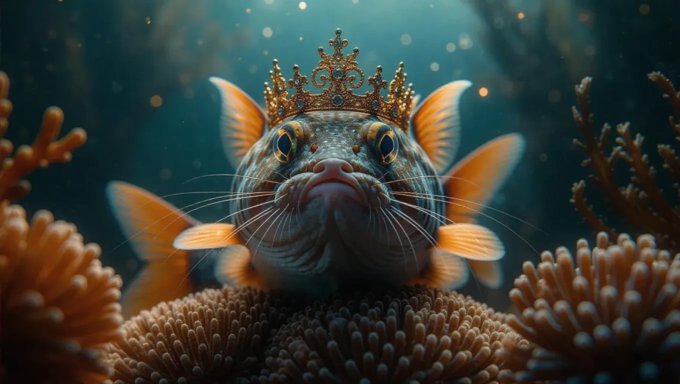 A charismatic mystical catfish wearing an ancient crown, lounging on a beautiful coral outcrop, surrounded by a swarm of tiny, bioluminescent zooplankton, in a captivating underwater fantasy landscape, with warm glimmers of water and soft light.