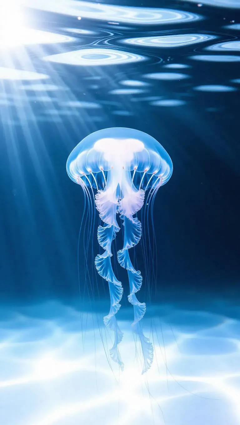 Minimalist underwater scene, a single jellyfish gracefully centered in midnight blue waters, soft gradients transitioning from dark to light, clean and elegant lines, ethereal glow.