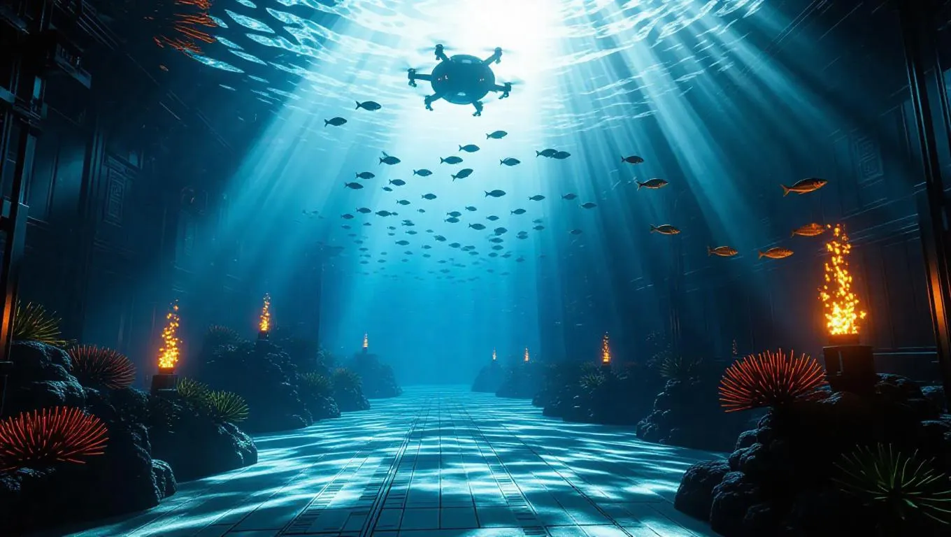 A futuristic human life scene underwater, featuring submerged defense systems and security drones, flames dancing in the currents, rays of sunlight piercing through the water, creating a protective play of light and shadow, cinematic lighting, highly detailed, surrounded by swirling schools of vigilant fish, vibrant coral reefs, and sleek, modern architecture.