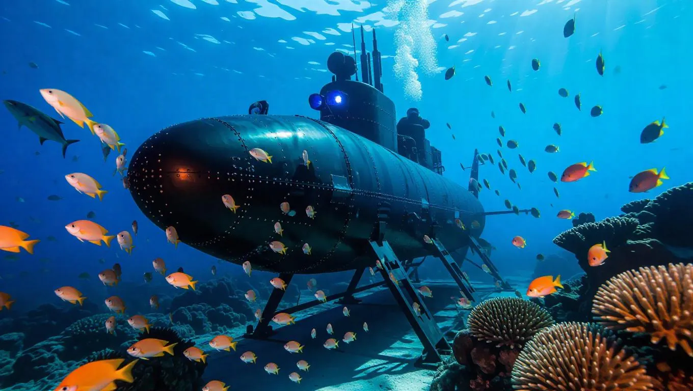 A group of dedicated underwater engineers constructs a high-tech submarine research station on the ocean floor, diligently welding metal beams and installing specialized equipment. Colorful fish and playful starfish hover nearby, observing their progress in the vibrant marine environment.