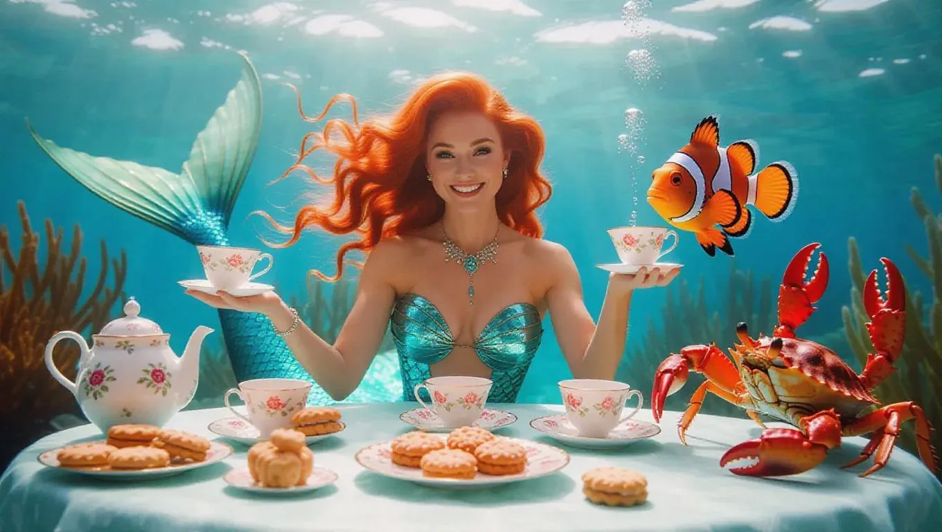 An elegant underwater tea party hosted by a mermaid, with her hair flowing while she holds teacups and plates of enchanted cookies. A crab plays the role of the butler, while a clownfish and a sea horse enjoy the treats.