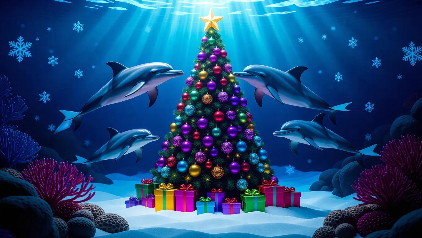 A festive underwater holiday celebration, dolphins adorning a vibrant coral Christmas tree, fish exchanging shiny gifts, jellyfish illuminating the scene with bioluminescent glow, snowflakes of bubbles drifting down, creating a magical and enchanting atmosphere.